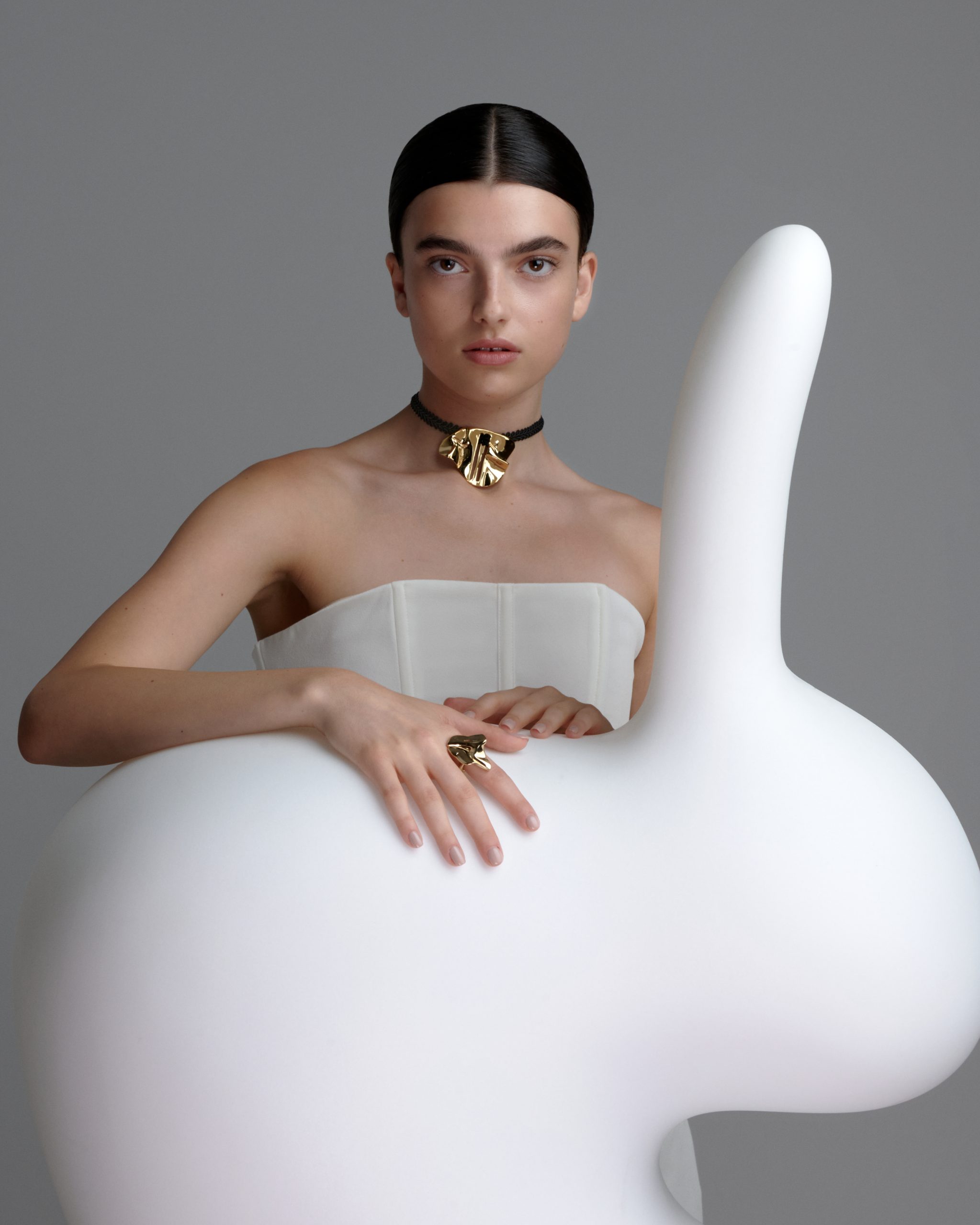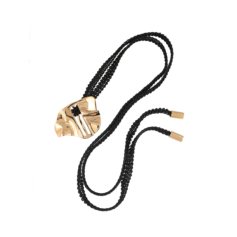 A bit funky and lots of presence. 24k gold plated chocker in the shape of a fabric with pasmanteri black cord, the bow is closed and spill along your back. One size. Length of each cord: 58cm
