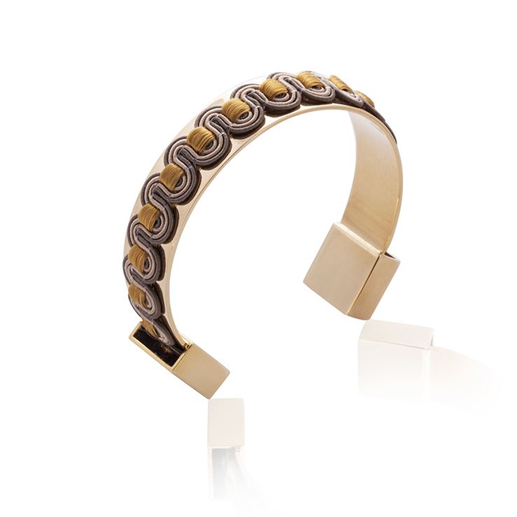 Gold thread snakes through regal pasmenterie on a polished gold cuff . 24K gold plate. 1.5 cm width. 19cm scope